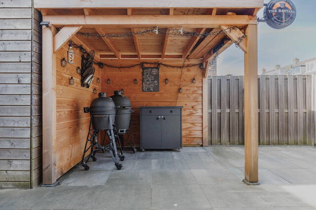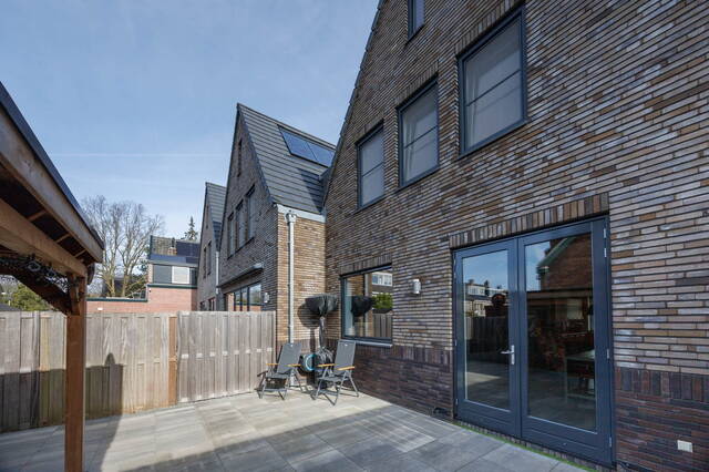 De zonnige achtertuin op het zuidwesten is mooi aangelegd en heeft een veranda voor warme en/of koude dagen. De berging is bereikbaar via de tuin én via de oprit.